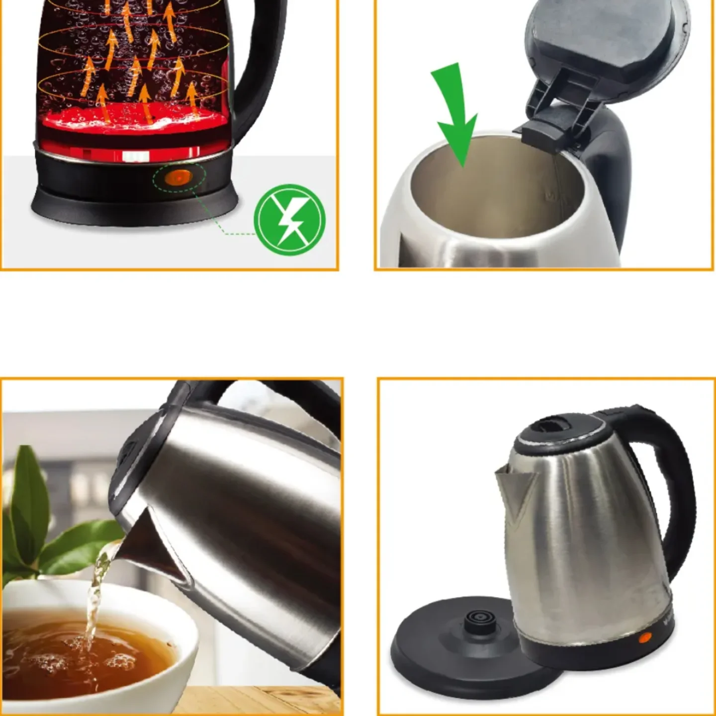 Upgrade your kitchen with this sleek and durable Electric Stainless Steel Kettle (1.8L–2.0L). Designed for speed and safety, it boils water in just minutes—perfect for tea, coffee, noodles, or hot water anytime you need it. The modern stainless steel finish adds elegance, while built-in features like auto shut-off and boil-dry protection ensure convenience and peace of mind.