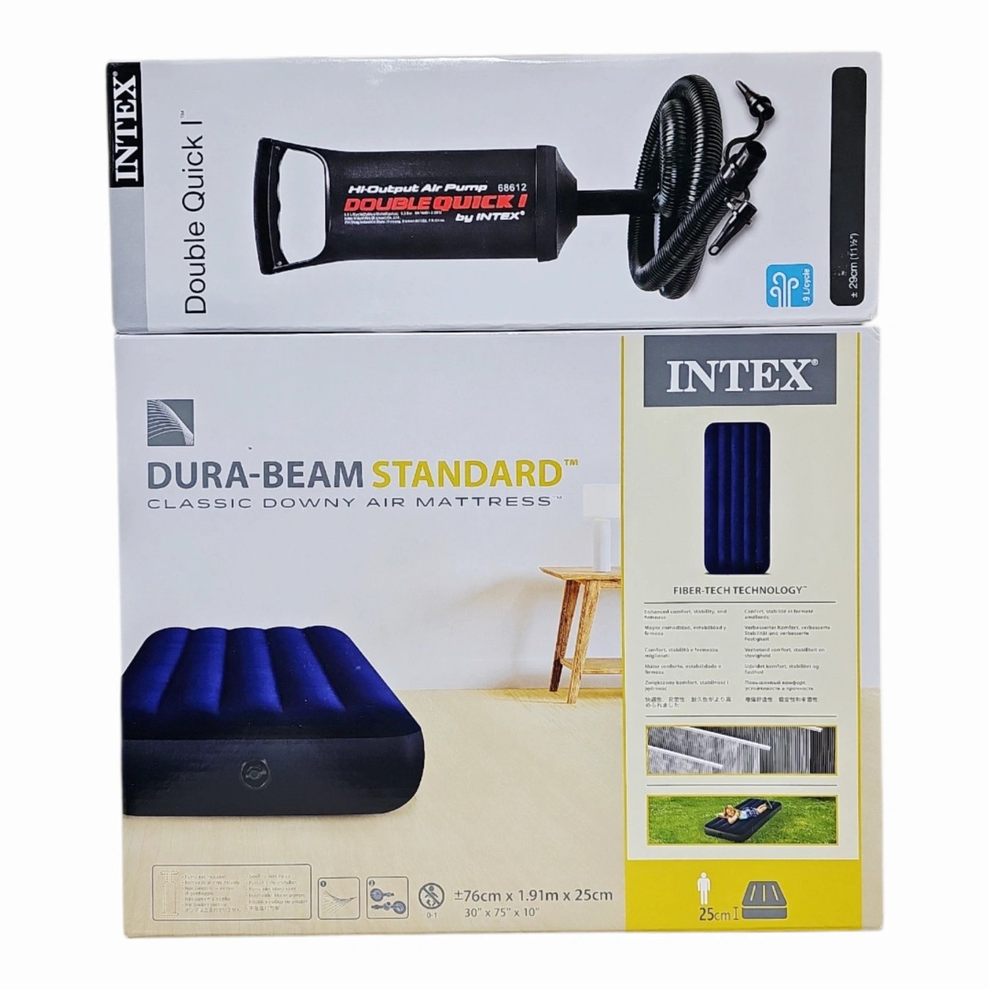 SKU: Intex Dura-Beam Standard Single Air Bed with Free Hand Pump – 191 x 76 x 25 cm | Portable Inflatable Mattress for Camping, Travel & Home Use